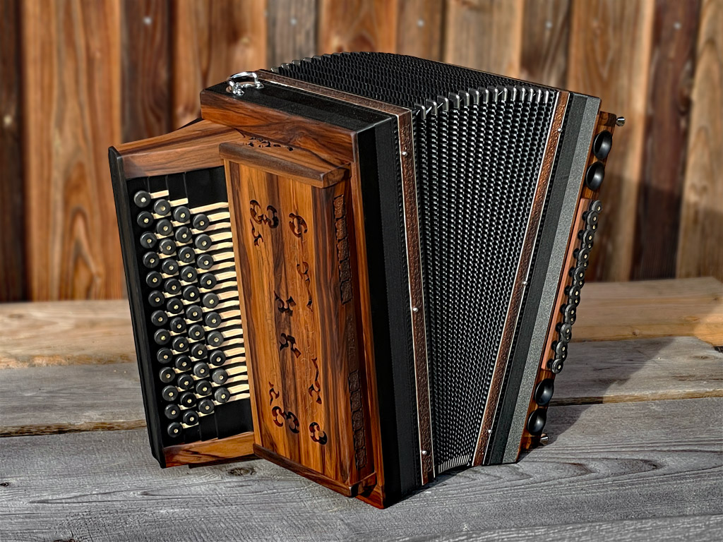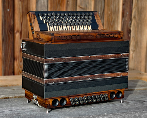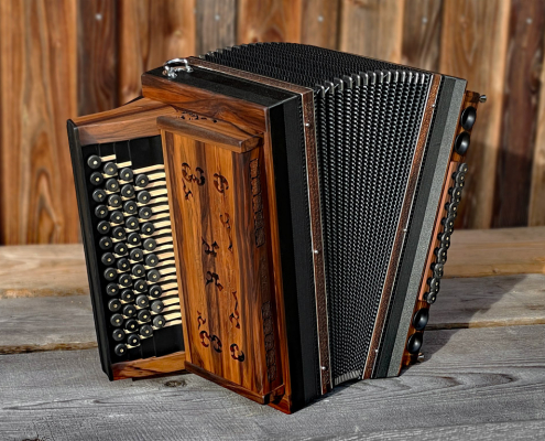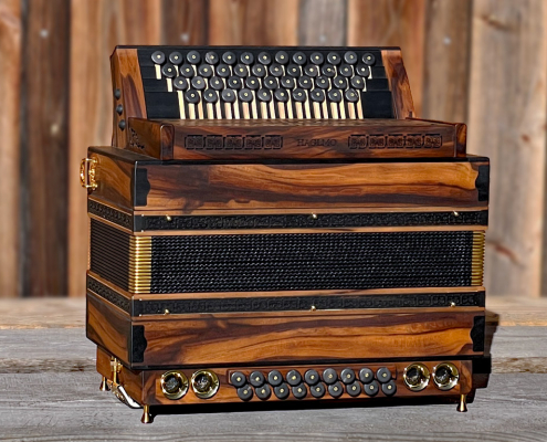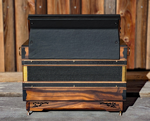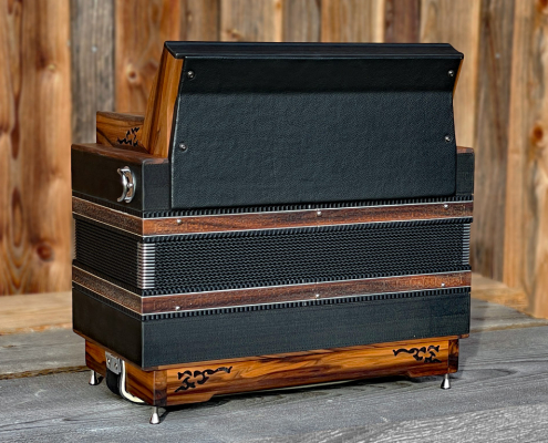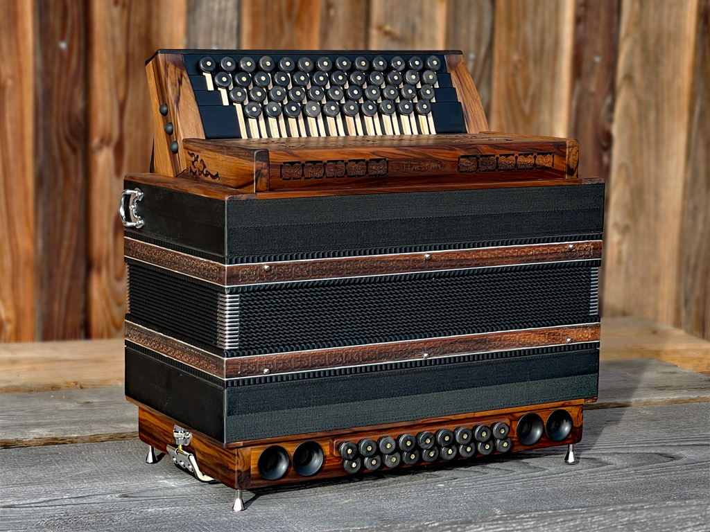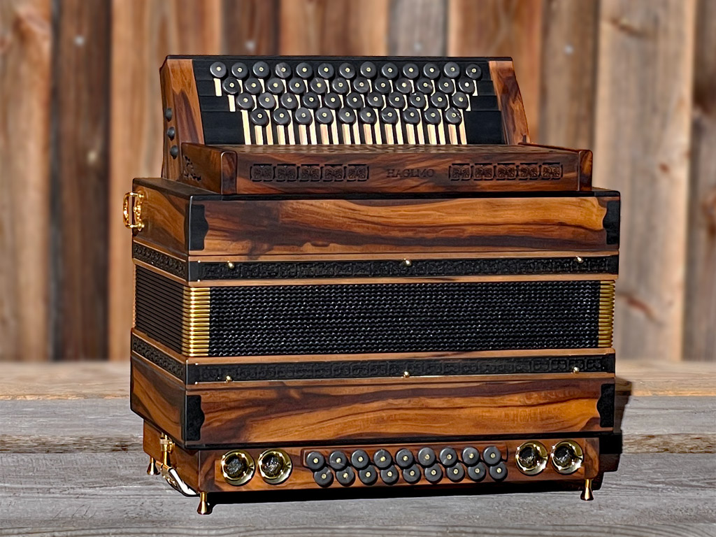 Optisch orientiert sich die HAGLMO 4er-Klasse an traditionellen, niederbayerischen Designvorbildern aus dem frühen 20. Jahrhundert. Unsere Harmonikas werden ausschließlich aus Massivholz gebaut. Dazu nutzen wir am liebsten heimische Holzarten. Die schlichten, eleganten Musterausfräsungen vor allem am Verdeck und die Bauform des Korpus verleihen unseren Instrumenten die charakteristische, seriöse Optik. Man kann aus bis zu sechs verschiedenen Verdeckvarianten wählen – je nachdem, welche Klangfärbung man damit unterstützen möchte.