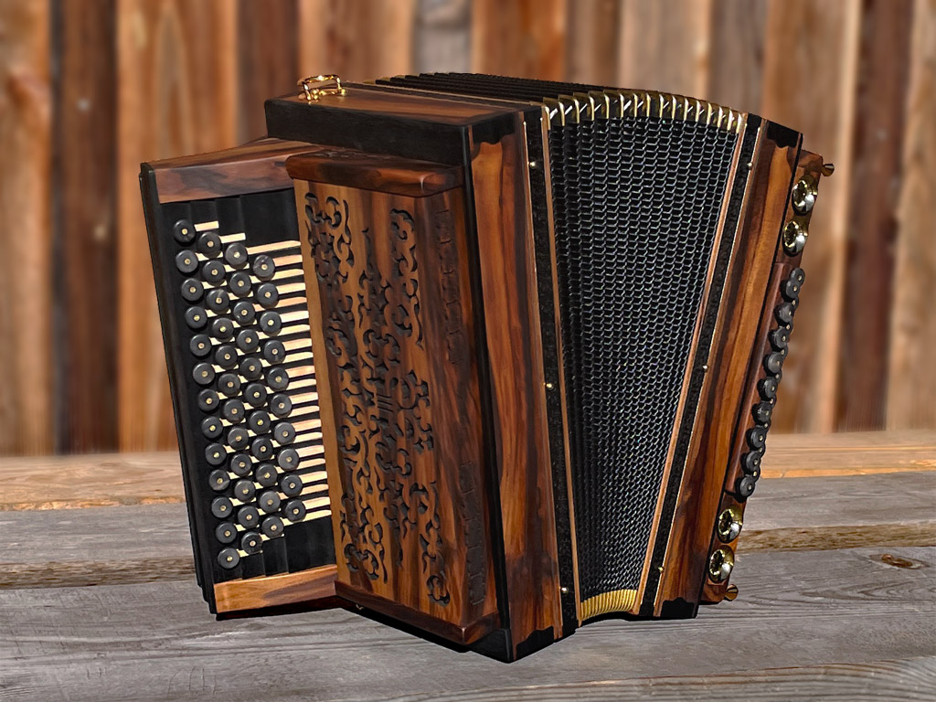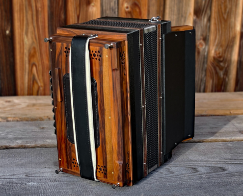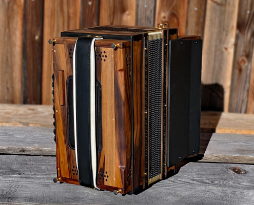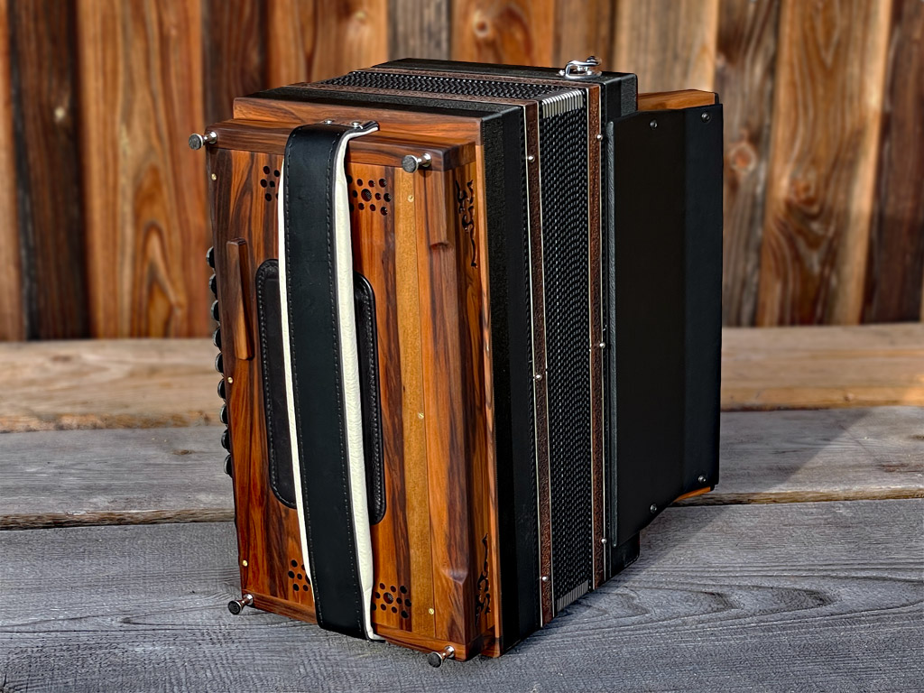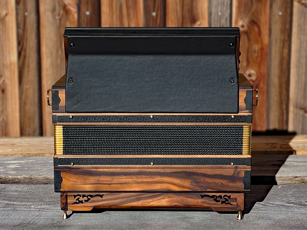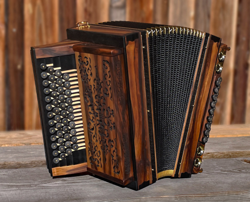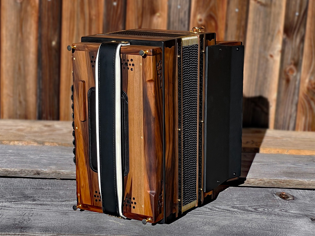 Optisch orientiert sich die HAGLMO 4er-Klasse an traditionellen, niederbayerischen Designvorbildern aus dem frühen 20. Jahrhundert. Unsere Harmonikas werden ausschließlich aus Massivholz gebaut. Dazu nutzen wir am liebsten heimische Holzarten. Die schlichten, eleganten Musterausfräsungen vor allem am Verdeck und die Bauform des Korpus verleihen unseren Instrumenten die charakteristische, seriöse Optik. Man kann aus bis zu sechs verschiedenen Verdeckvarianten wählen – je nachdem, welche Klangfärbung man damit unterstützen möchte.